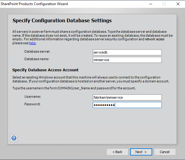 $dbManagedAccount = Get-SPManagedAccount -Identity fabrikam\mimpool