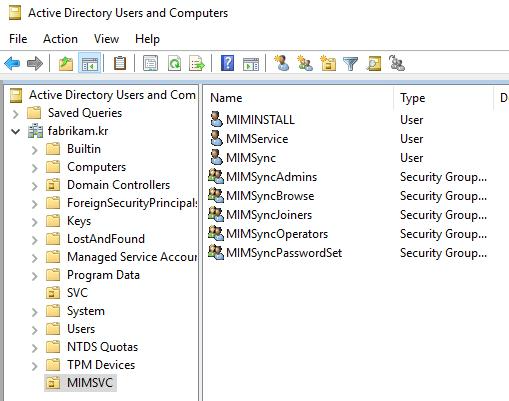 New-ADGroup –name MIMSyncOperators –GroupCategory Security –GroupScope Global –SamAccountName MIMSyncOperators -Path "OU=MIMSVC,DC=Fabrikam,DC=kr"