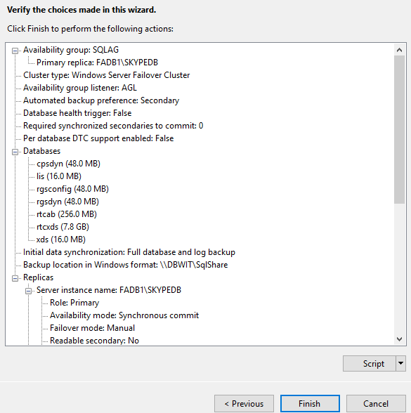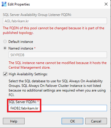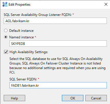 Install-CsDatabase -Update -ConfiguredDatabases -SqlServerFqdn AGL.fabrikam.kr -Verbose