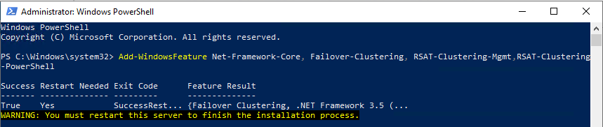 Add-WindowsFeature Net-Framework-Core, Failover-Clustering, RSAT-Clustering-Mgmt,RSAT-Clustering-PowerShell