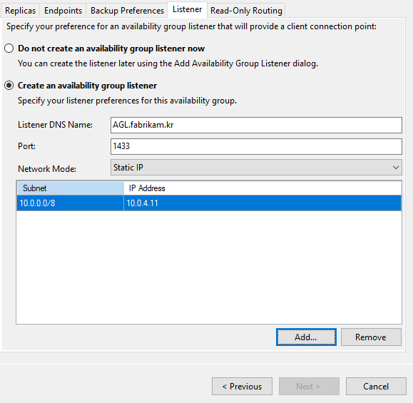 Listener Tab - Add - Create an availability group listener 항목 추가