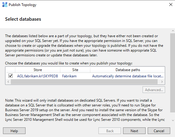 Install-CsDatabase -Update -ConfiguredDatabases -SqlServerFqdn AGL.fabrikam.kr -Verbose