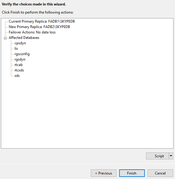 Invoke-Sqlcmd -Query “ALTER DATABASE [rtcxds] SET RECOVERY FULL WITH NO_WAIT;” -ServerInstance “FADB1\SKYPEDB”