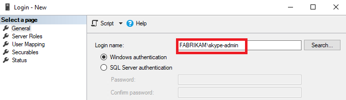 SQL과 Skype 의 서비스 계정을 생성합니다.