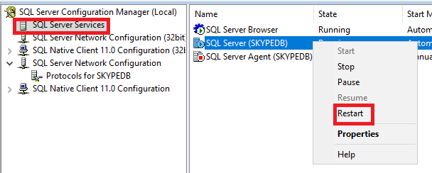 SQL Server 를 우클릭하여 서비스를 Restart 합니다.