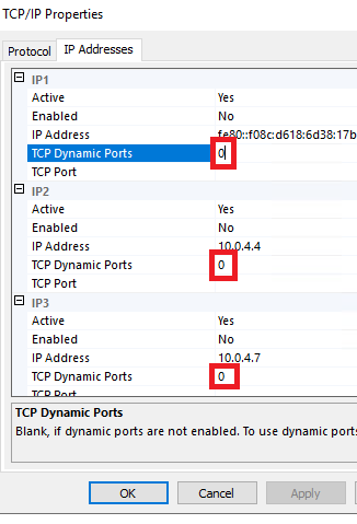 TCP Dynamic Ports 는 전부 제거 합니다.