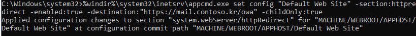 %windir%\system32\inetsrv\appcmd.exe set config "Default Web Site" -section:httpredirect -enabled:true -destination:"https://mail.contoso.kr/owa" -childOnly:true