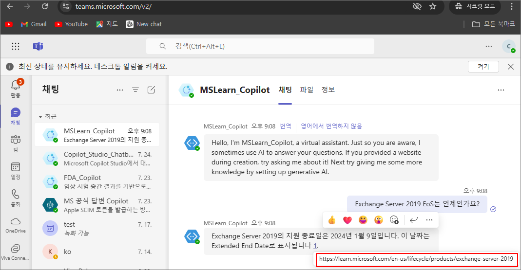 우측의 Copilot 테스트 채팅창에서 질문을 입력하여 답변이 올바르게 진행되는지 확인합니다.