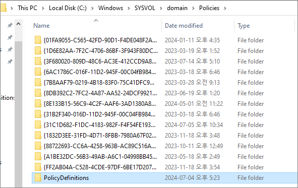 AD에서 정책에 배포하는 방식에 따라서 PolicyDefinitions 폴더를 적절한 위치에 필요한 언어만 복사합니다. (정책관련 부분은 AD 파트이기 때문에 여기서 다루지는 않겠습니다.)