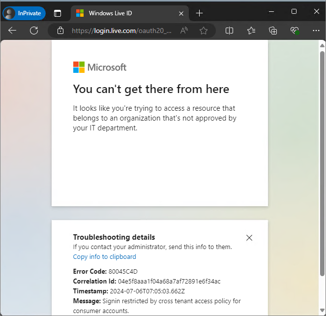 다른 테넌트로 로그인 시도하여도 차단되는 것을 알 수 있습니다.
