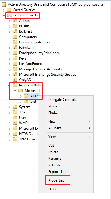 ADUC → 도메인 → Program Data → Microsoft → ADFS → Properties
