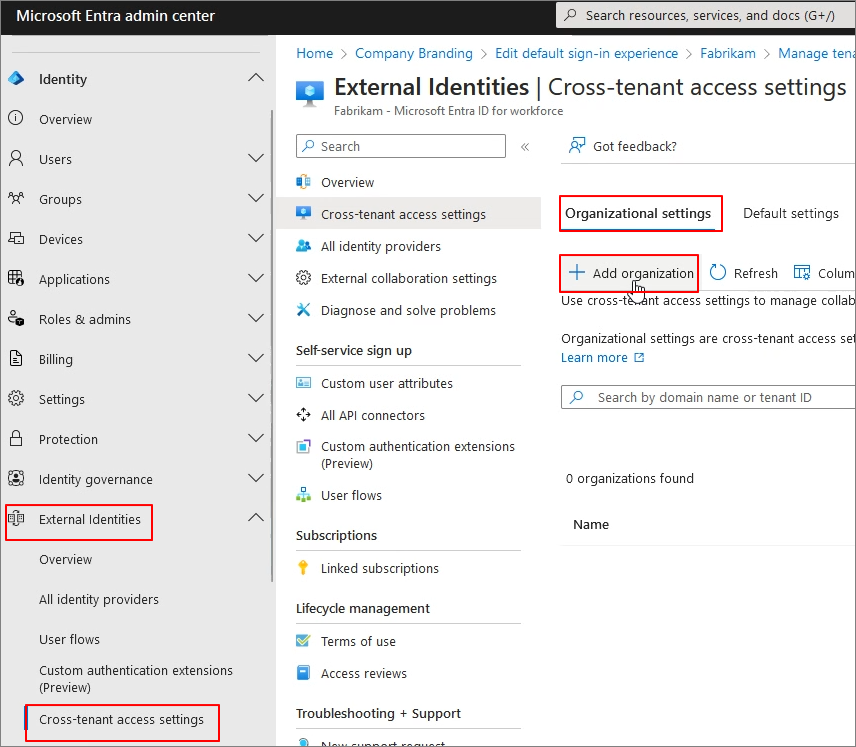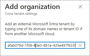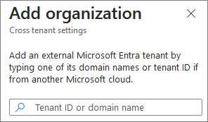 Entra Admin Center -> External Identities -> Cross-tenant access settings -> Organizational settings -> Add organization