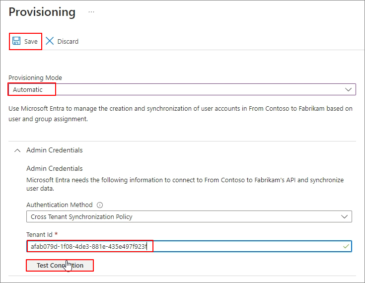 Provisioning Mode: Automatic -> Admin Credentials -> Tenant Id: Target Tenant ID -> Test Connection -> Save