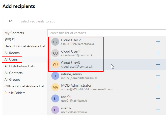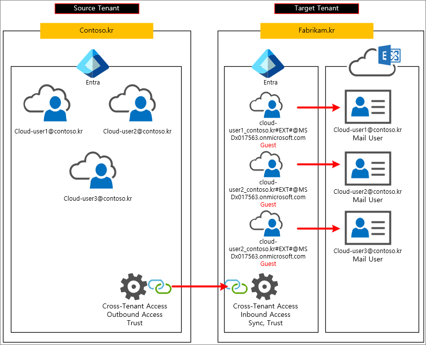 테넌트간 동기화 설정은 아래와 같이 Source Tenant에서 Outbound 설정, Target Tenant에서 Inbound 설정을 진행하여 Guest 계정 형태로 동기화 하는 방식으로 진행됩니다. Guest 계정은 Mail User 속성을 가지고 있기 때문에 주소록에서 확인할 수 있습니다.