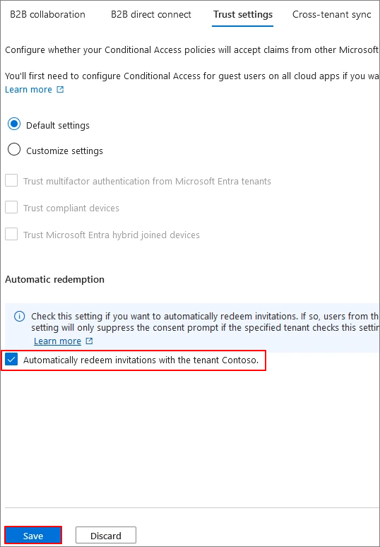 Trust settings -> Automatically redeem invitations with the tenant [Tenant Name] -> Check -> Save