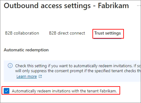 Trust settings -> Automatically redeem invitations with the tenant Fabrikam -> Check -> Save