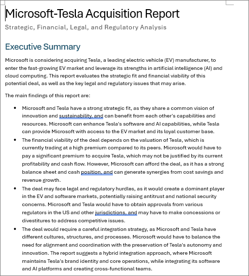 Deliver a concise report that outlines strategic benefits, legal and regulatory assessments, financial impacts, and an integration strategy. The report should include market analysis, company analysis, financial projections, legal and regulatory considerations, synergy potentials, integration plans, risk management strategies, and an execution timeline, concluding with actionable recommendations.