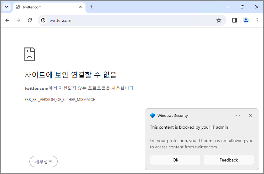 Edge 에서 twitter.com 접속 -> SmartScreen + Web Contents Filtering 적용 -> 차단 확인