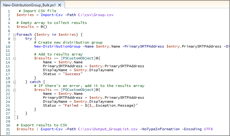 New-DistributionGroup -Name $entry.Name -PrimarySMTPAddress $entry.PrimarySMTPAddress -DisplayName $entry.Displayname -OrganizationalUnit "OU=Group,OU=BulkTest,DC=corp,DC=contoso,DC=kr" -Type Security -ErrorAction Stop