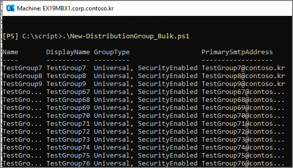 New-DistributionGroup -Name TestGroup1 -PrimarySMTPAddress TestGroup1@contoso.kr -DisplayName TestGroup1 -OrganizationalUnit 'OU=Group,OU=BulkTest,DC=corp,DC=contoso,DC=kr' -Type Security