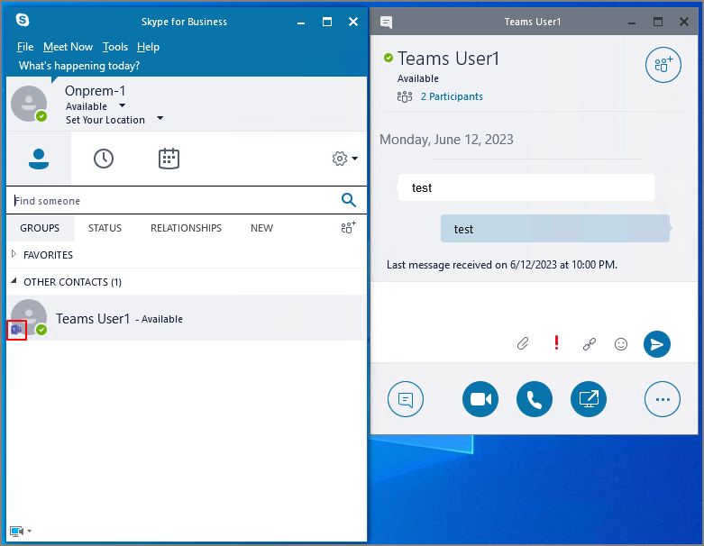 Teams 상에서는 해당 사용자가 비즈니스용 Skype를 사용하고 있습니다. 로 표시됩니다.