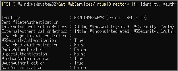 Exchange Server Powershell에서 가상 디렉터리 인증 설정 확인