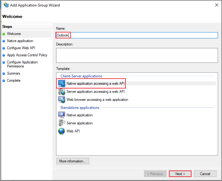 이름 지정 -> Native application accessing a web API 선택 -> Next