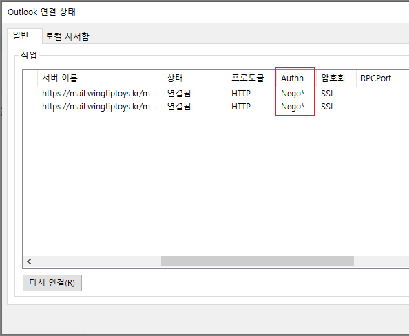 기존에는 Outlook 연결시 Windows 인증 (기본인증)창으로 나타납니다.