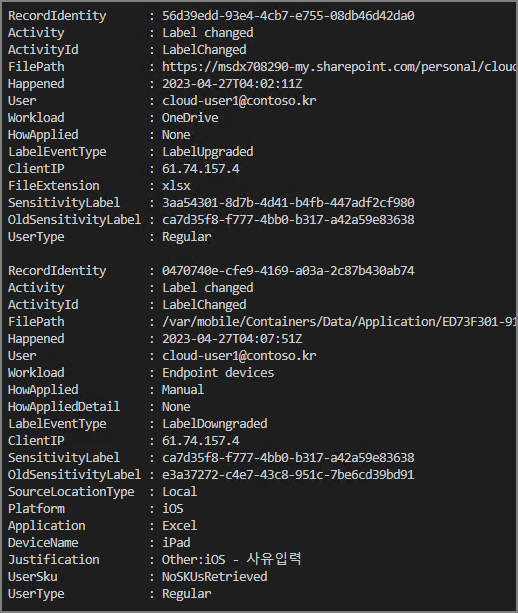 $selectedProperties = (($res.ResultData) | ConvertFrom-Json) | sort Happened | Select-Object Happened, RecordIdentity, User, Activity, ActivityId, Application, ClientIP, DataState, DestinationLocationType, DeviceName, DlpAuditEventMetadata, EmailInfo, EndpointOperation, EnforcementMode, EvidenceFile, FileExtension, FilePath, FileSize, FileType, Hidden, HowApplied, HowAppliedDetail, IRMContentId, IsProtected, IsProtectedBefore, JitTriggered, Justification, LabelEventType, MDATPDeviceId, OldSensitivityLabel, Platform, PolicyMatchInfo, PreviousFileName, PreviousProtectionOwner, ProductVersion, ProtectionEventType, ProtectionOwner, ProtectionType, RetentionLabel, RMSEncrypted, @{Name='SensitiveInfoTypeBucketsData'; Expression={$_.SensitiveInfoTypeBucketsData -join ','}}, @{Name='SensitiveInfoTypeData'; Expression={$_.SensitiveInfoTypeData -join ','}}, SensitivityLabel, Sha1, Sha256, SourceLocationType, TargetDomain, TargetFilePath, TargetPrinterName, TemplateId, UserSku, UserType, Workload