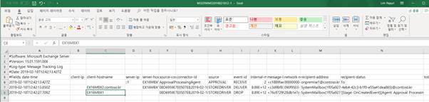 그렇다면 명령어로 한번에 쉽게 CSV 파일로 보는 방법이 없을까? 라는 생각이 듭니다. Get-MessageTrackingLog -ResultSize unlimited |export-csv C:\trace\trace1.csv -Encoding UTF8 로 추출해 보았습니다.