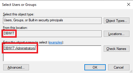 로컬 위치를 지정한 뒤, Administrators 그룹을 지정합니다.