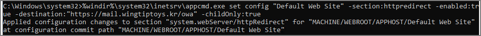 | %windir%\system32\inetsrv\appcmd.exe set config "Default Web Site" -section:httpredirect -enabled:true -destination:"https://mail.wingtiptoys.kr/owa" -childOnly:true |