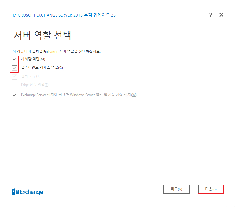 사서함 역할, 클라이언트 액세스 역할 선택한 뒤, 다음