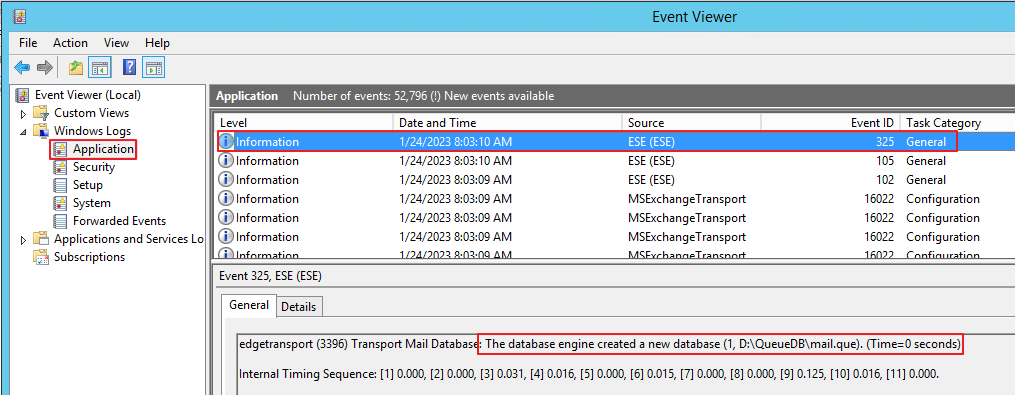 이벤트 로그 상에서 새 큐DB가 생성된 것이 기록됩니다.