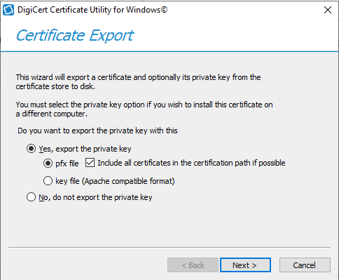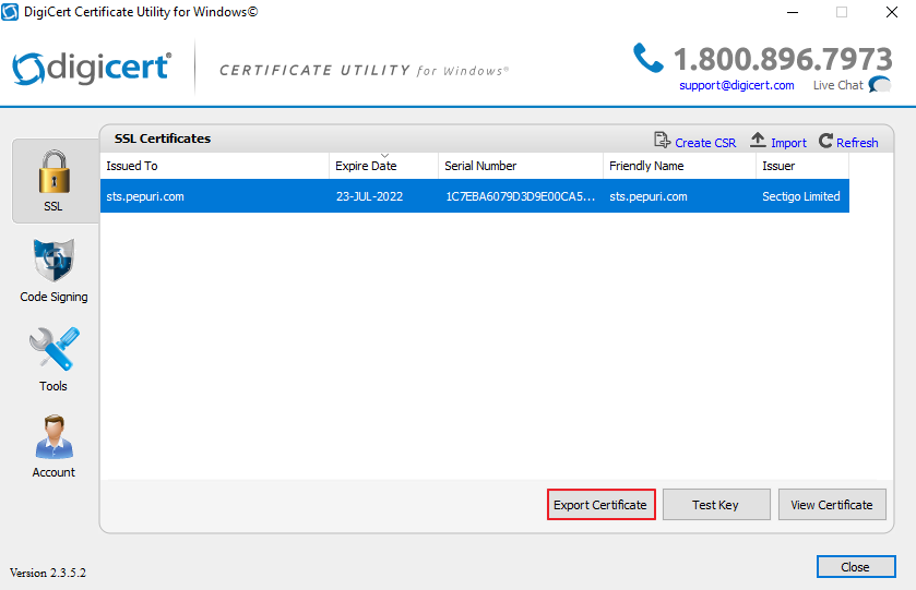 ADFS 머신에서 Digicert Util 을 실행 - Export Certificate