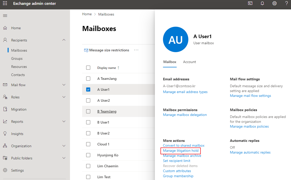 Exchange 관리센터 - Recipients - Mailboxes - 사용자 선택 - Manage litigation hold