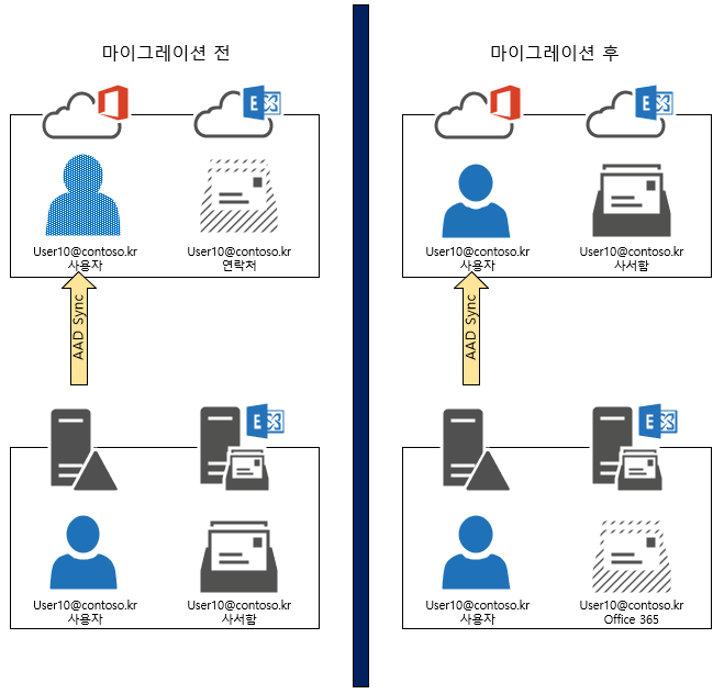 On-Premise 사서함은 Azure AD 상에서 메일 사용자라는 연락처 개체 형태로 등록됩니다. 그리고 마이그레이션이 완료되면, On-premise 에서는 Office 365 로 변경됩니다. 대략 마이그레이션 전과 후는 아래의 그림과 같습니다.