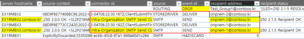 4. test_group1@contoso.kr 은 실제 사서함이 없고, 전달할 대상이 없기 때문에 DROP 처리한 것으로 추정됩니다.