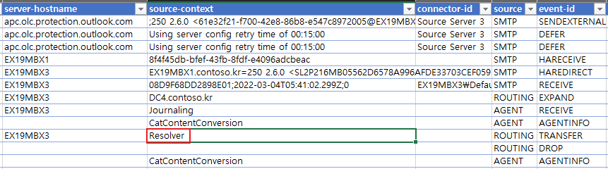 3. Resolver 라는 것은 위에서 언급했듯이 recipient resolution(받는 사람 확인)을 진행했다는 것으로 해석됩니다. 이후 onprem-1, onprem-2로 각각 메일이 Transfer 된 것으로 확인됩니다.