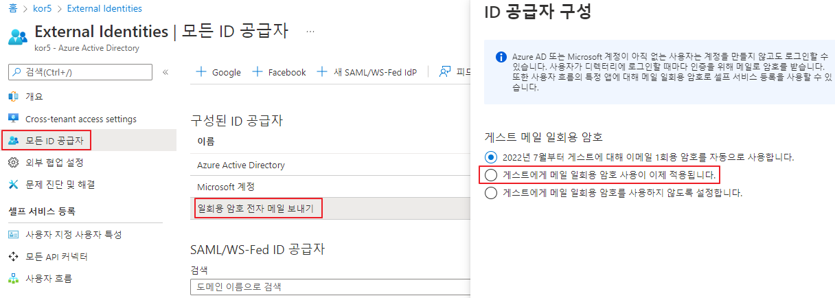 우선 Azure AD -> External Identities -> 모든 ID 공급자로 이동하여 일회용 암호 전자 메일 보내기가 활성화 되어 있는지 확인합니다.