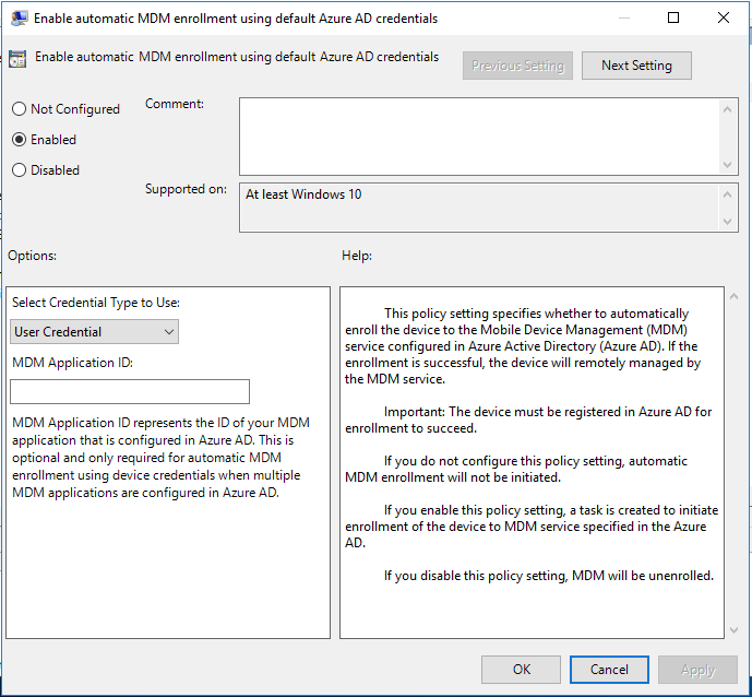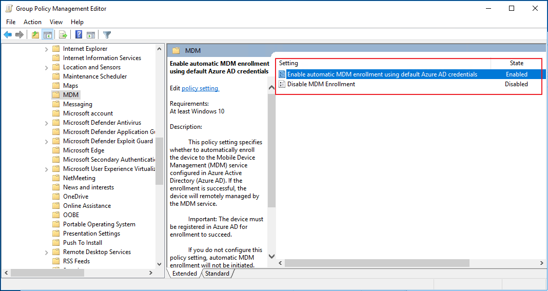 Domain Join, MDM 관련 GPO를 아래와 같이 활성하였습니다. 이부분 역시 기술자료에는 없으므로 선택 사항입니다.