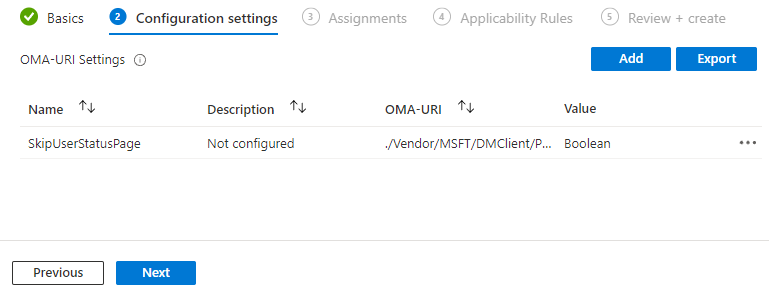 OMA-URI: ./Vendor/MSFT/DMClient/Provider/MS DM Server/FirstSyncStatus/SkipUserStatusPage