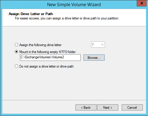 ExchangeDatabases 경로에서 다음 명령어로 해당 볼륨과 맵핑합니다.