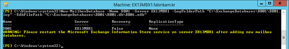 New-MailboxDatabase -Name DB01 -Server EX13MBX1 -LogFolderPath "C:\ExchangeDatabases\DB01\DB01.log" -EdbFilePath "C:\ExchangeDatabases\DB01\DB01.db\DB01.edb"