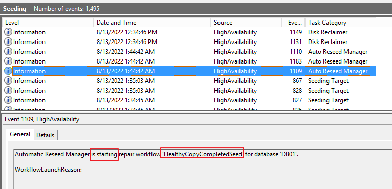 Event Viewer -> Applications and Services Logs -> Microsoft -> Exchange -> HighAvailability -> Seeding 으로 이동합니다.