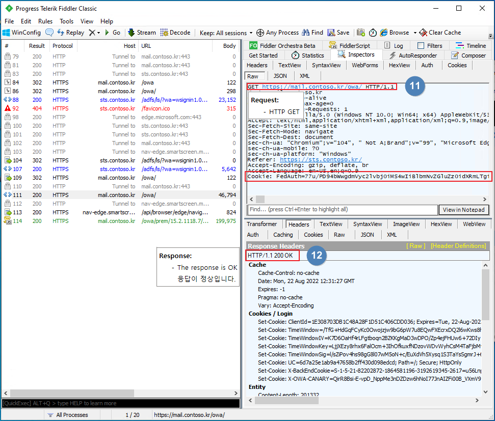 ADFS 서버에서 인증이 완료되어 Relying Party (OWA)로 Redirect 되는 과정은 Step 9~12에 해당합니다.