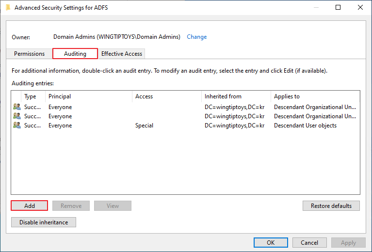 [1-5] Enable auditing on an ADFS object