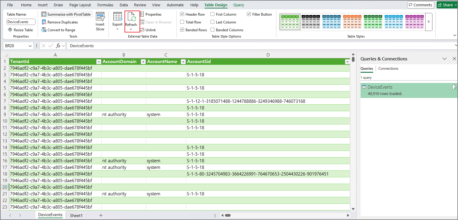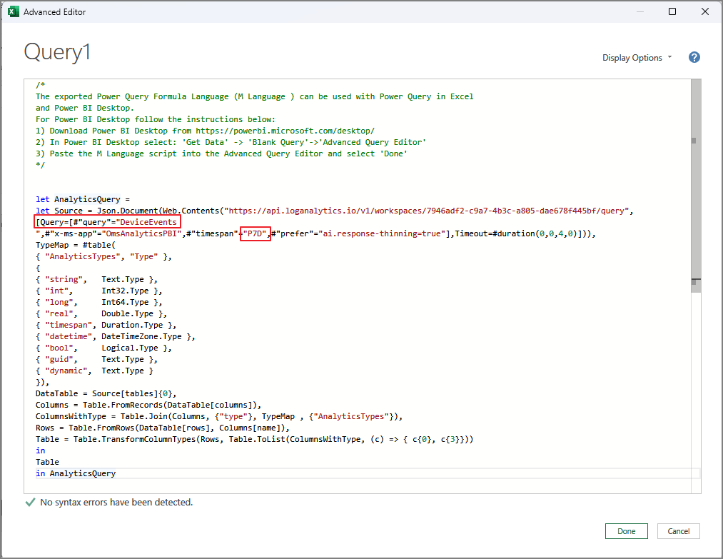 확인해 보니 Sentinel/Log Analytics에서 Export한 M Query를 Excel Power Query에 그대로 붙여넣어 연결하는 방식이 가능했습니다. Excel을 중심으로 분석하는 빈도가 높다면, 이 방식이 꽤 실용적입니다.