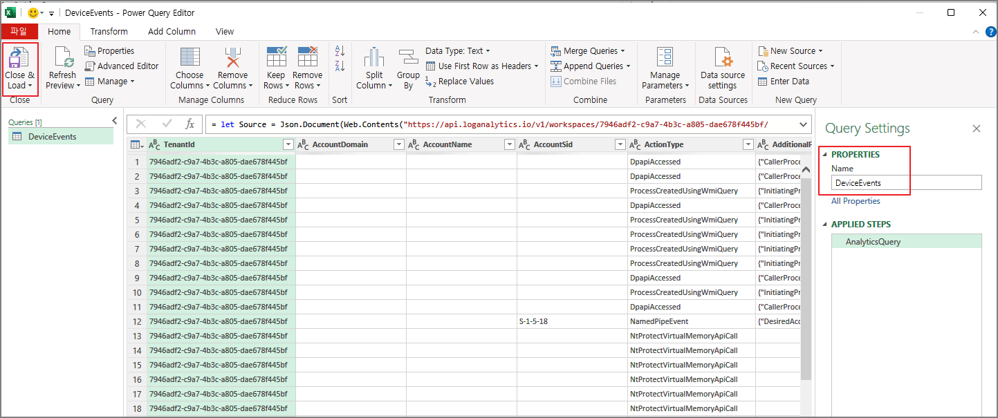 - 조직 계정(Organizational account)으로 인증 후 Close & Load 하면 테이블로 로드됩니다.