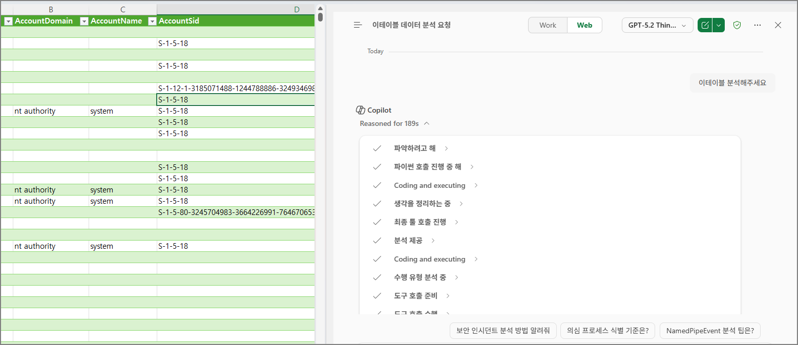 Copilot이 데이터(예: MDE 관련 테이블)를 인식하면 요약/추세/이상 패턴 등 기본 분석을 빠르게 수행할 수 있습니다.